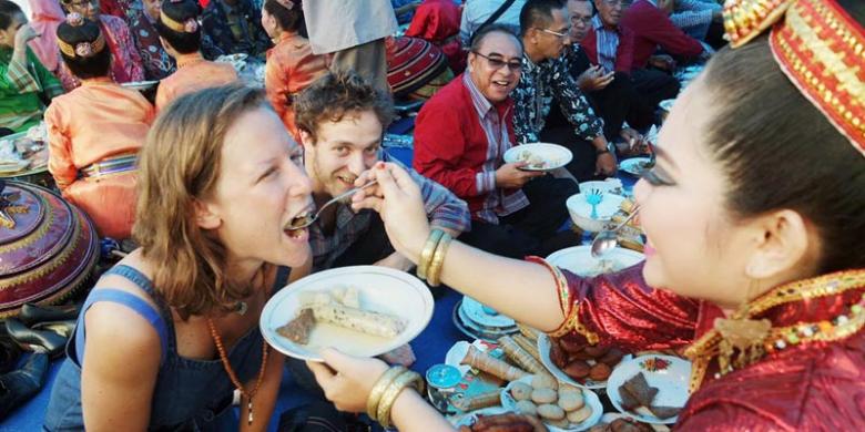 Wisatawan mancanegara mengikuti acara makan bersama pekande-kandea di